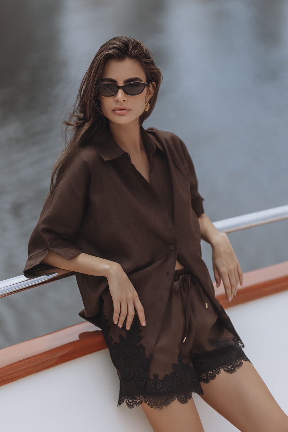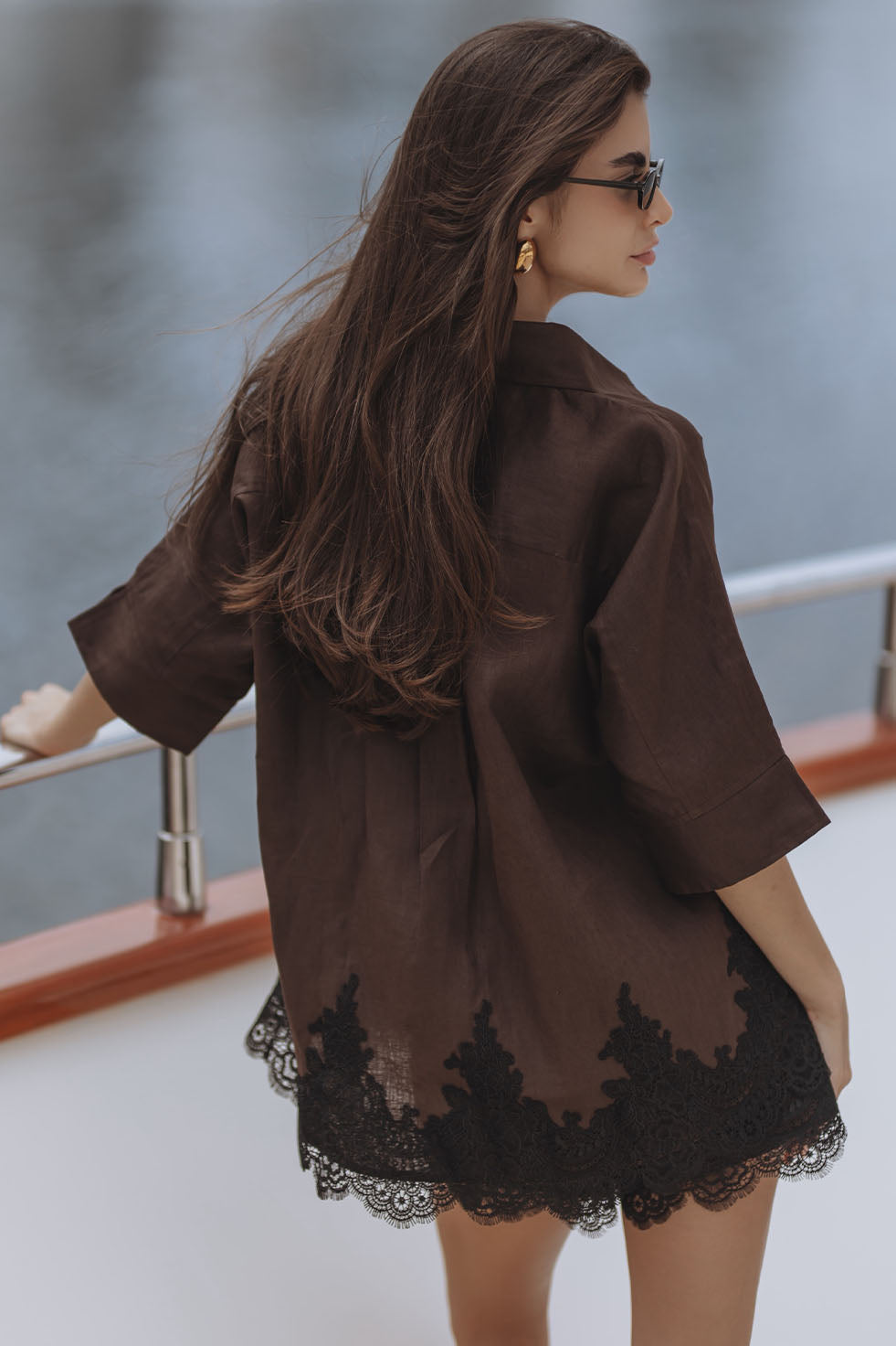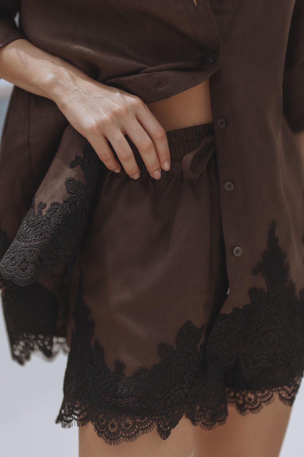 AURELIE LACE TRIM LINEN MINI DRESS - CHOCOLATE