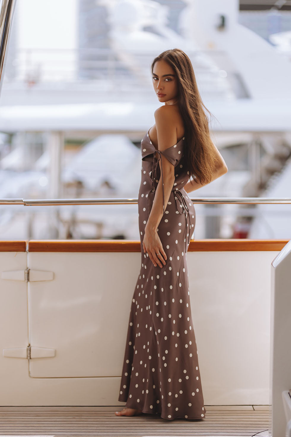 DARCY SATIN MAXI DRESS - MOCHA TAUPE/IVORY POLKA