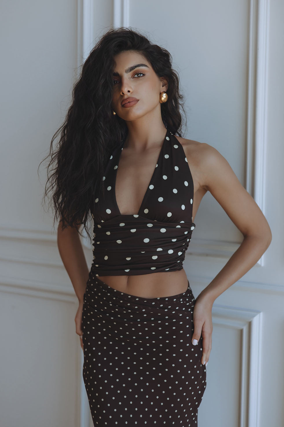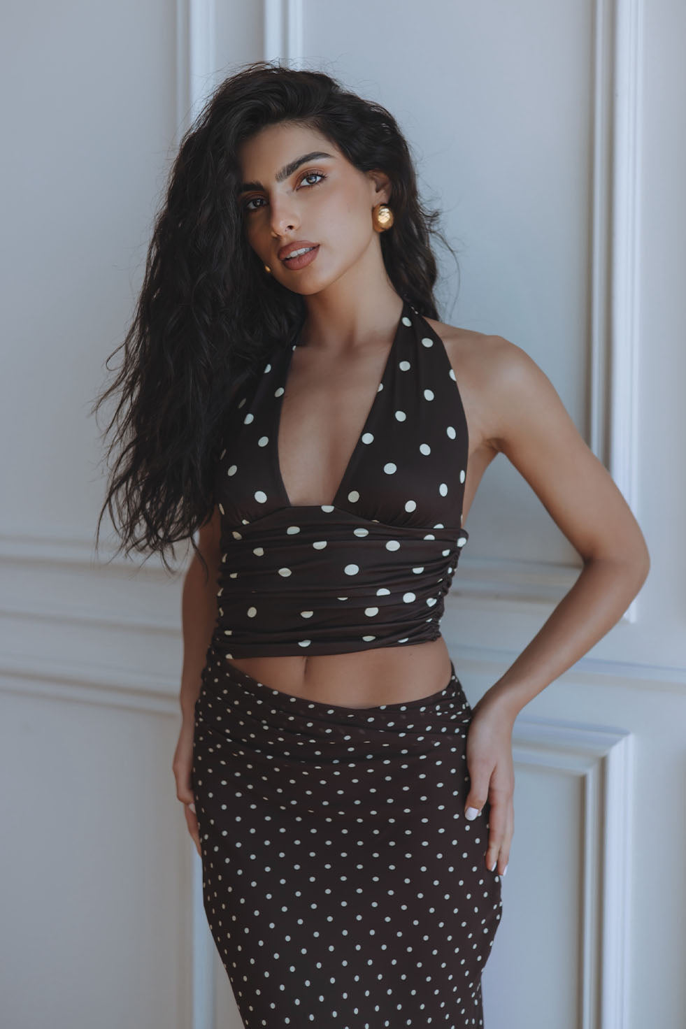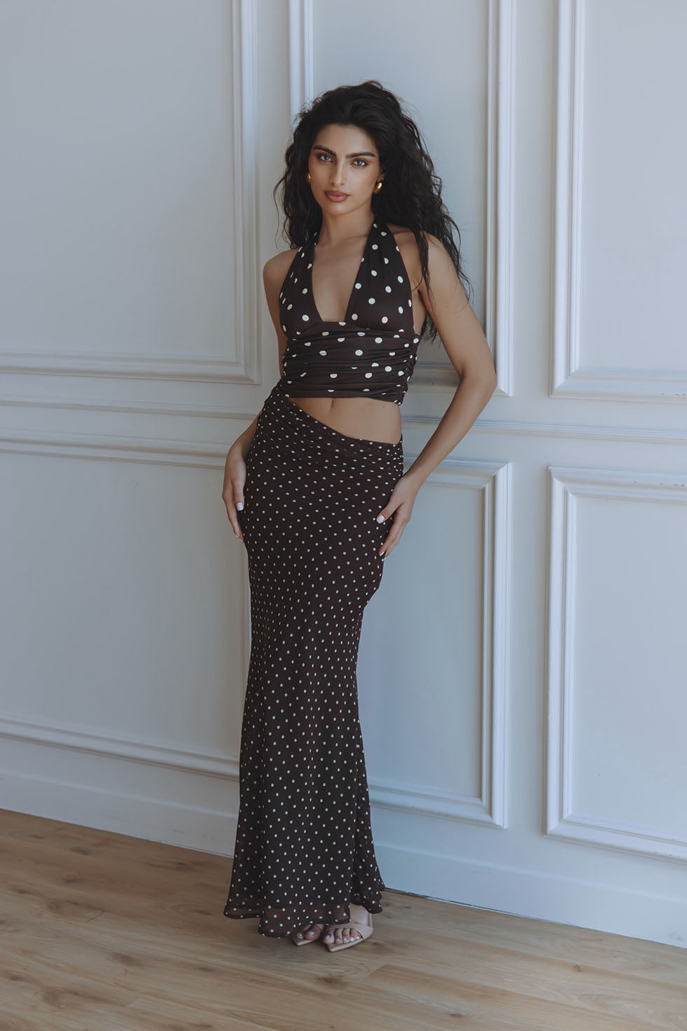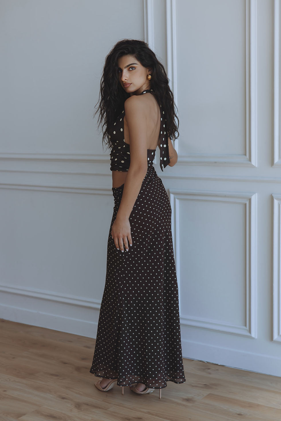 VALERIA HALTER CUTOUT MAXI DRESS - CHOC/LEMON POLKA