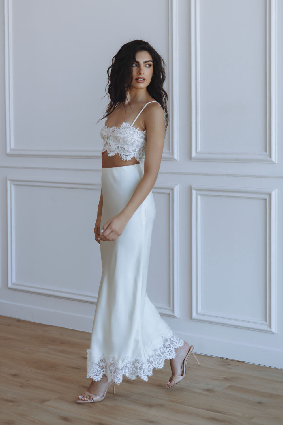 ELISAN LACE SATIN MIDI SKIRT - IVORY