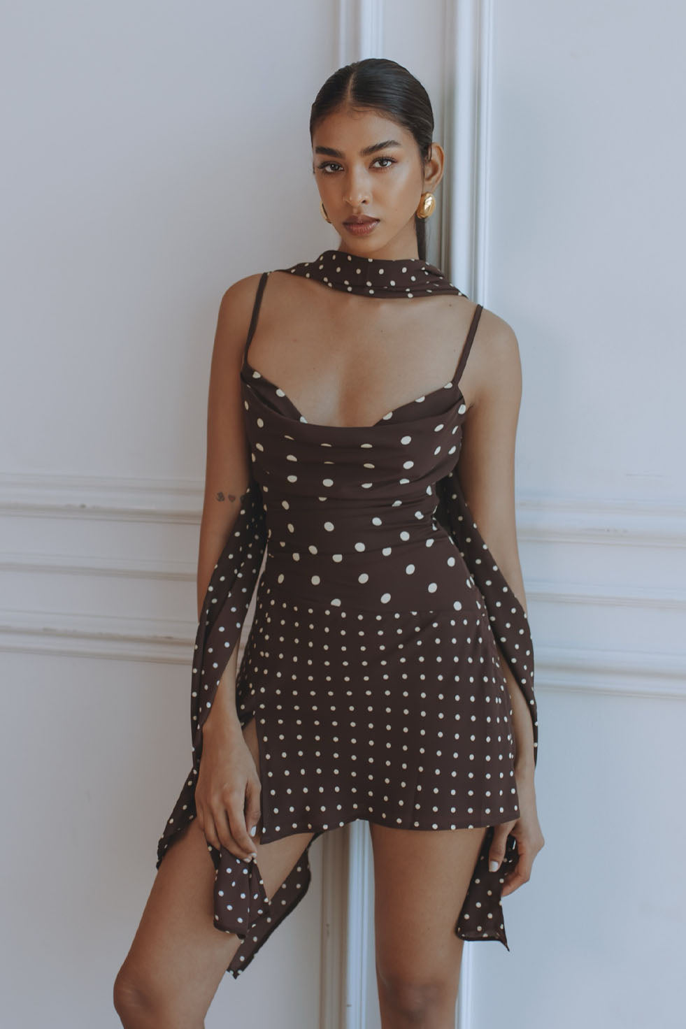 ALORA SCOOP NECK MINI DRESS - CHOC/LEMON POLKA