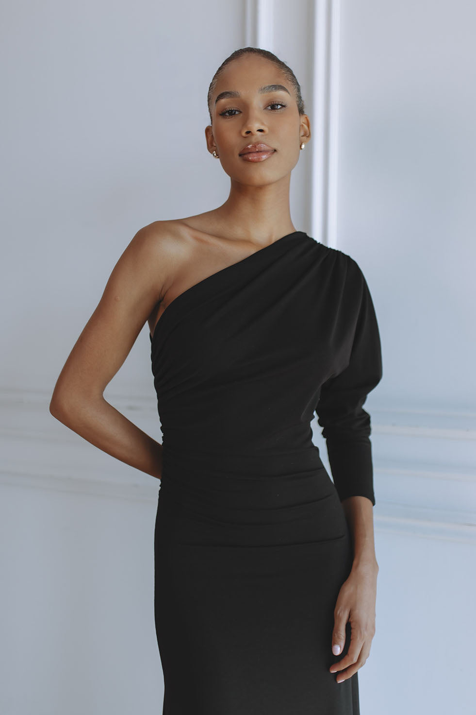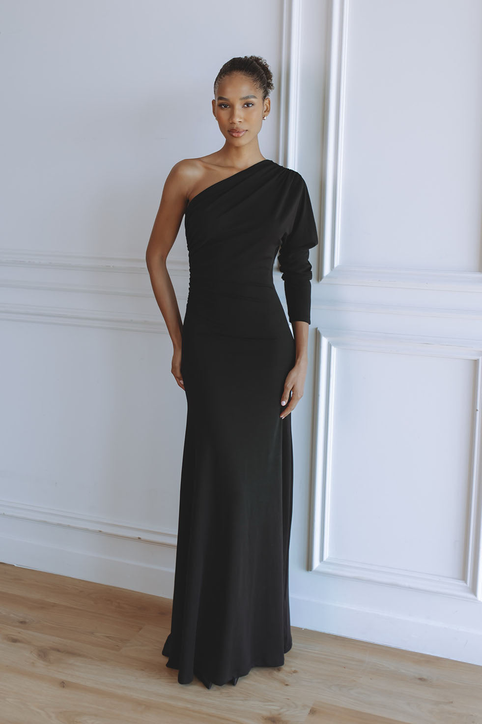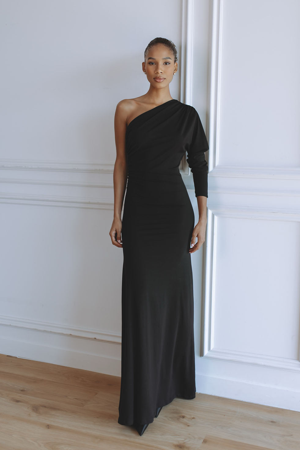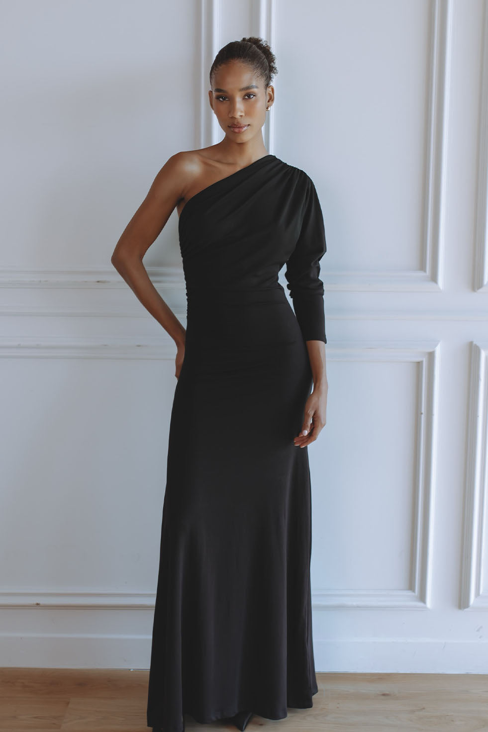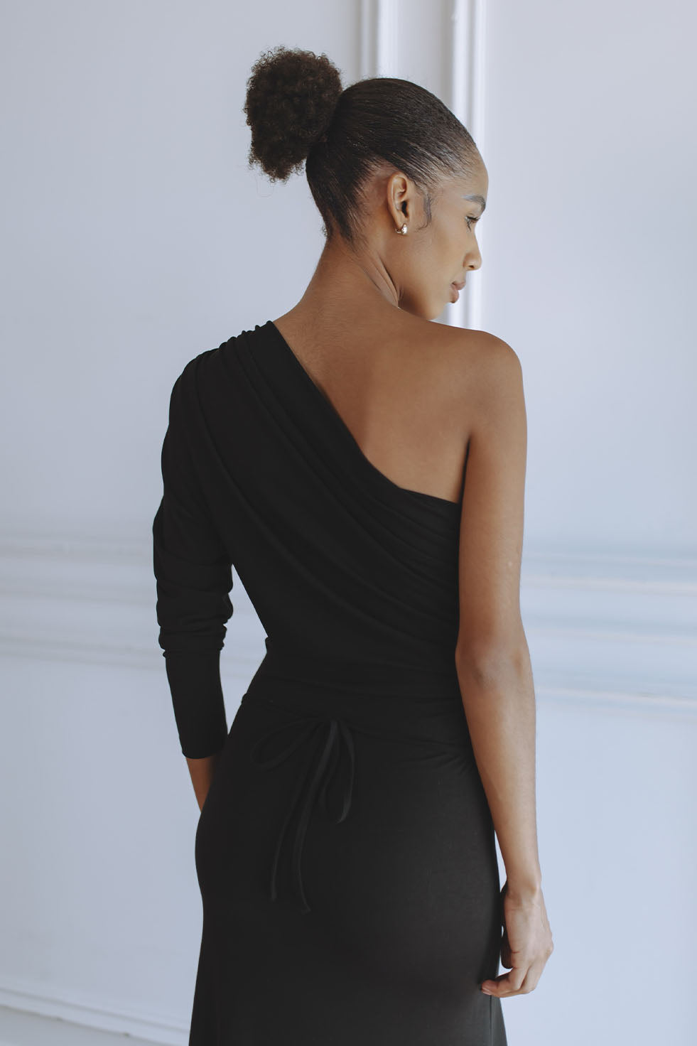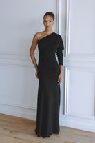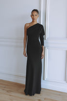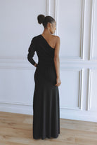Timeless and refined, the Sabine Jersey Maxi Dress in black is a modern statement of sophistication. Crafted from our signature soft stretch jersey, it features a one-shoulder silhouette with gentle draping and a fluid, body-skimming fit. Two adjustable strings at each side tie elegantly at the back, creating a cinched waist that defines the figure while maintaining effortless comfort. The classic black tone makes Sabine a versatile piece for any occasion, day or night.