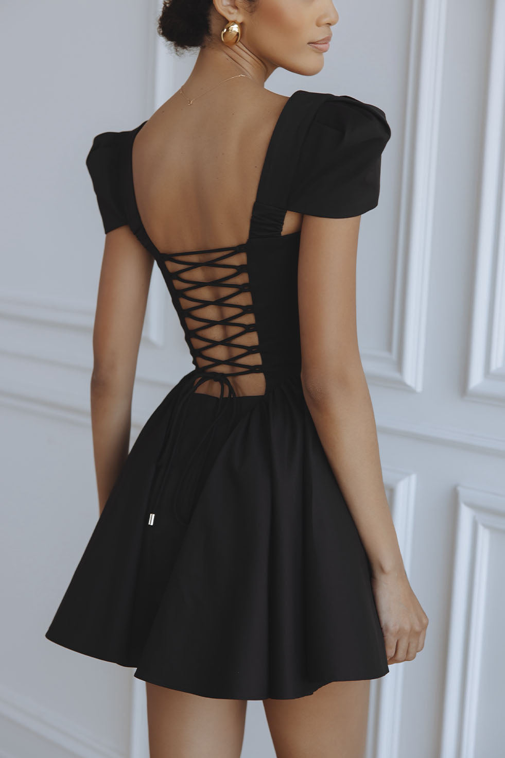 The front button detailing elongates the body, while the cinched waist flows into a flared mini skirt for a flattering, feminine finish. At the back, a lace-up corset closure reveals an open, adjustable detail that enhances the hourglass shape and adds a touch of sensuality.