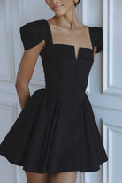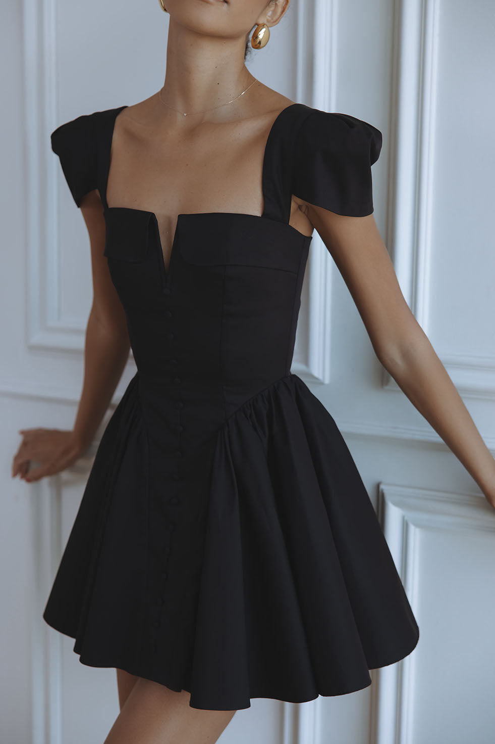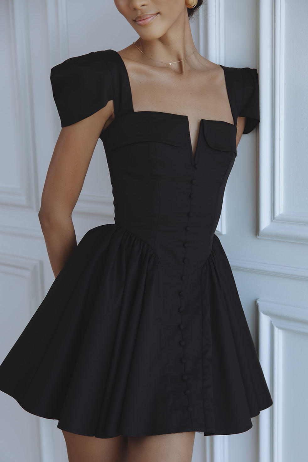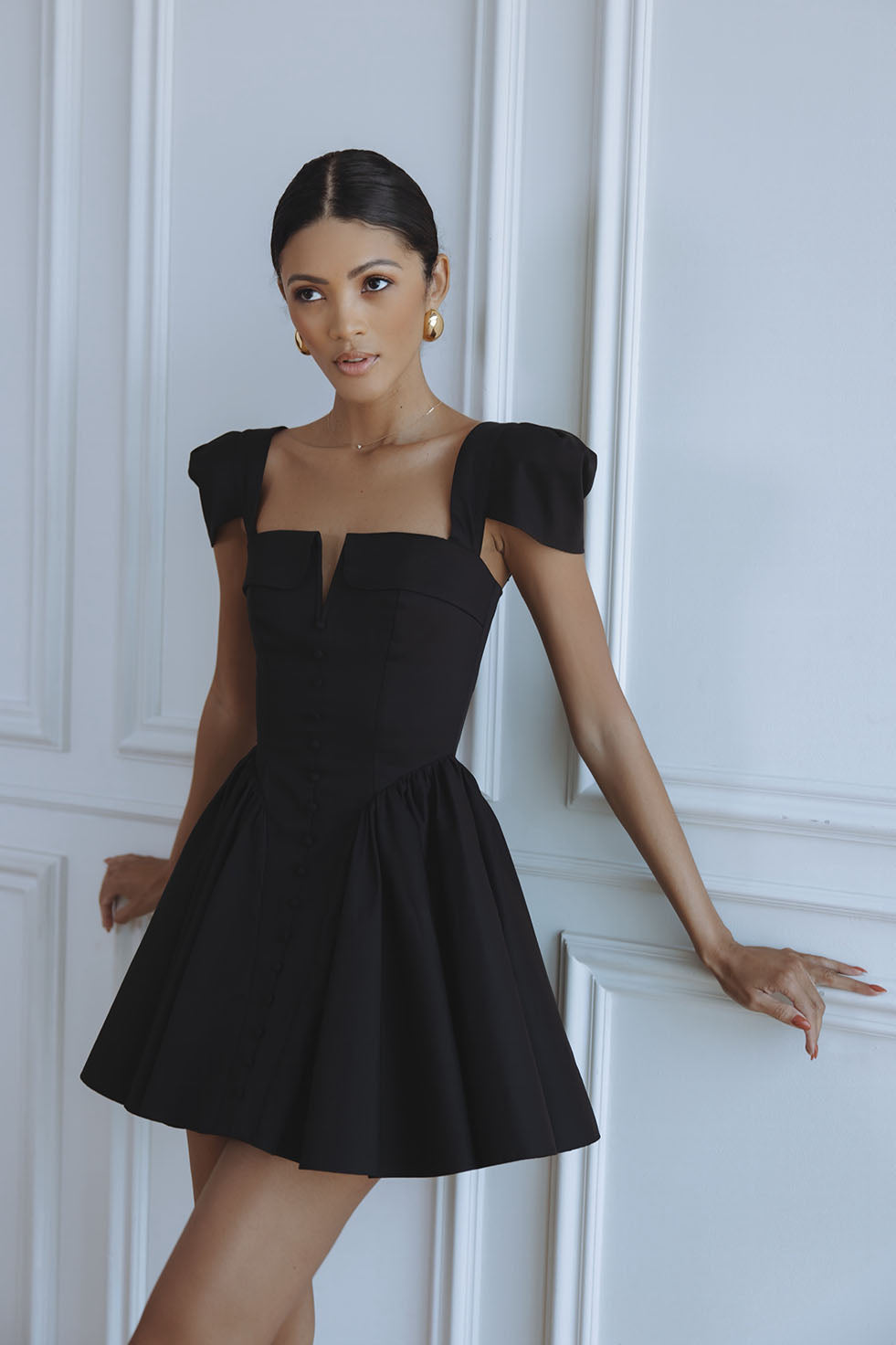 Sculpted and striking, the Antonella Mini Dress is a modern take on classic corsetry. Cut from structured cotton, this silhouette features a fitted bodice with an elegant square neckline and subtle sweetheart shaping, balanced by softly contoured cap sleeves that frame the shoulders beautifully.