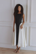 The Campbell Linen Midi Dress in cream and black is a statement piece defined by its clean lines and bold contrast. Designed in breathable linen, this sleeveless silhouette features a fitted black bodice that flows seamlessly into a flared cream skirt with elegant side panels. The smocked back adds both comfort and flexibility, ensuring a flattering fit on every figure. Finished at a graceful midi length, it’s the ideal blend of structure and ease.