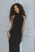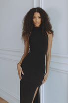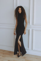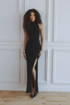Turn heads in the Isabelle Maxi Dress, crafted in a luxurious black stretch fabric with delicate gold lurex threads for a subtle shimmer under the light. This sleek silhouette features a high neckline, body-hugging fit, and a daring thigh-high slit that adds just the right amount of drama. Designed with comfort in mind, the fabric offers stretch for a smooth and flattering fit that moves with you. Perfect for evening soirées, black-tie events, or any occasion where effortless elegance is a must.