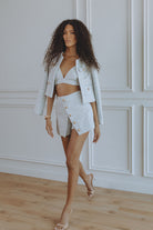 Tailored from textured bouclé in a soft blue-grey hue, the Margaux Bralette embodies effortless sophistication. Designed with a flattering V-neckline and fixed slender straps, it offers a structured yet feminine silhouette. Pair it with the matching Margaux Skort and crop blazer for a chic, coordinated look that transitions seamlessly from day to night.