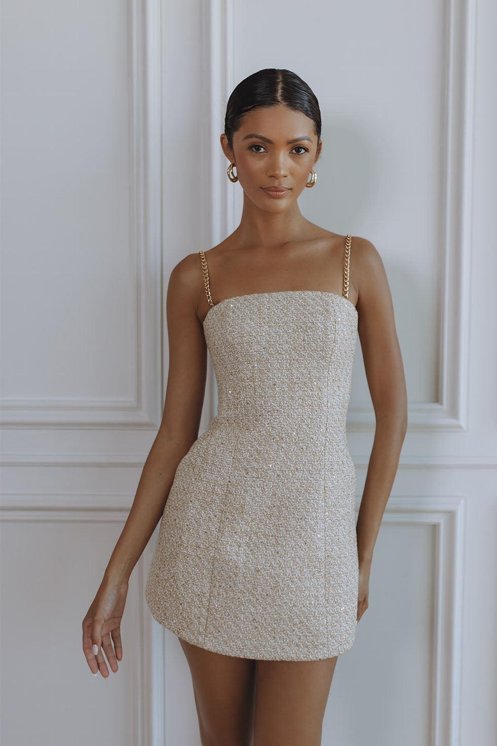 Refined yet striking, the Minola Bouclé Hourglass Mini Dress is designed to sculpt and flatter with effortless elegance. Crafted from textured light-gold bouclé woven with a subtle shimmer, this mini dress features a clean straight neckline and luxe gold-tone chain straps that elevate the silhouette with a modern, jewellery-inspired finish.