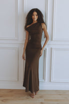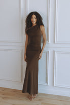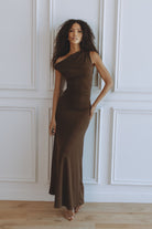 A timeless silhouette with a refined modern edge. Zaria is crafted in our ultra-soft stretch jersey, designed to skim and flatter the body with minimal effort. The asymmetric one-shoulder neckline creates subtle drama, complemented by delicate gold-tone shoulder accents. Soft ruching along the waist enhances your natural shape, while the full-length skirt drapes fluidly with every step. The rich chocolate hue adds warmth and depth — the perfect evening neutral.