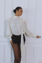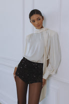 Meet the Wrenley — your statement mini short designed for nights that call for sparkle. Cut in a flattering high-waist silhouette, these shorts are embellished with black sequins that catch the light from every angle. The curved hem elongates the leg while the soft inner lining ensures comfort from dinner to dance floor. Pair with a sheer blouse or a sleek bodysuit for a look that feels bold, confident and effortlessly glam.