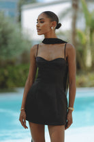 Cut to captivate, the ELARA hourglass dress sculpts the silhouette with a contoured bodice, delicate straps, and a flowing chiffon scarf that adds dramatic allure. Crafted from smooth, structured fabric, this little black dress blends elegance with edge. ELARA is your go-to for effortless sophistication and unforgettable entrances.