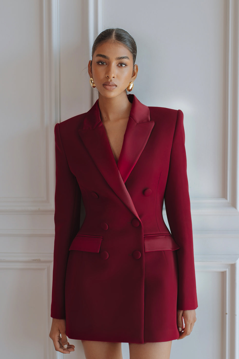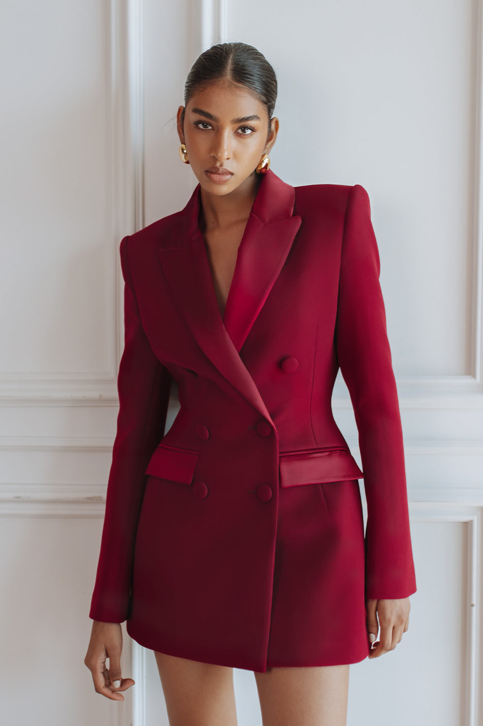 Turn heads in the Amara Tuxedo Blazer Mini Dress in Burgundy — a statement piece designed for modern evening dressing. Cut from luxurious crepe, this tailored mini features a rich burgundy hue, satin-finish lapels, and strong sculpted shoulders for a powerful, feminine silhouette. The double-breasted front and defined waist create a flattering hourglass shape that feels both sharp and sophisticated.