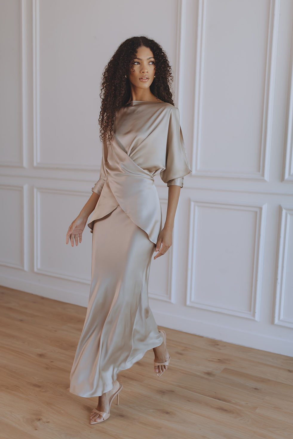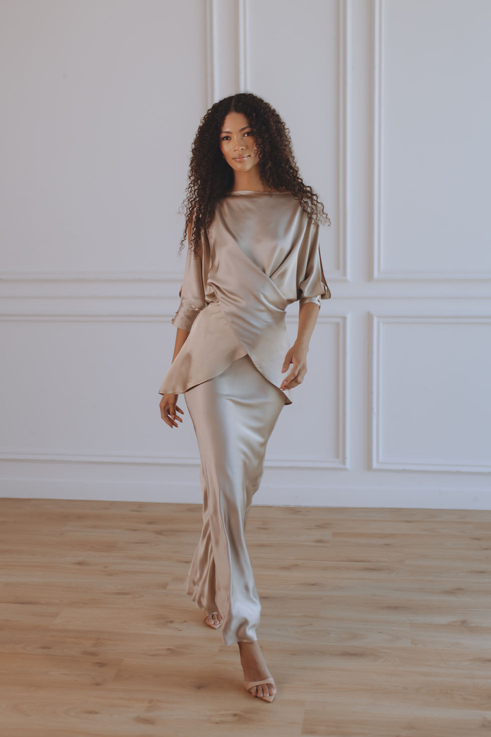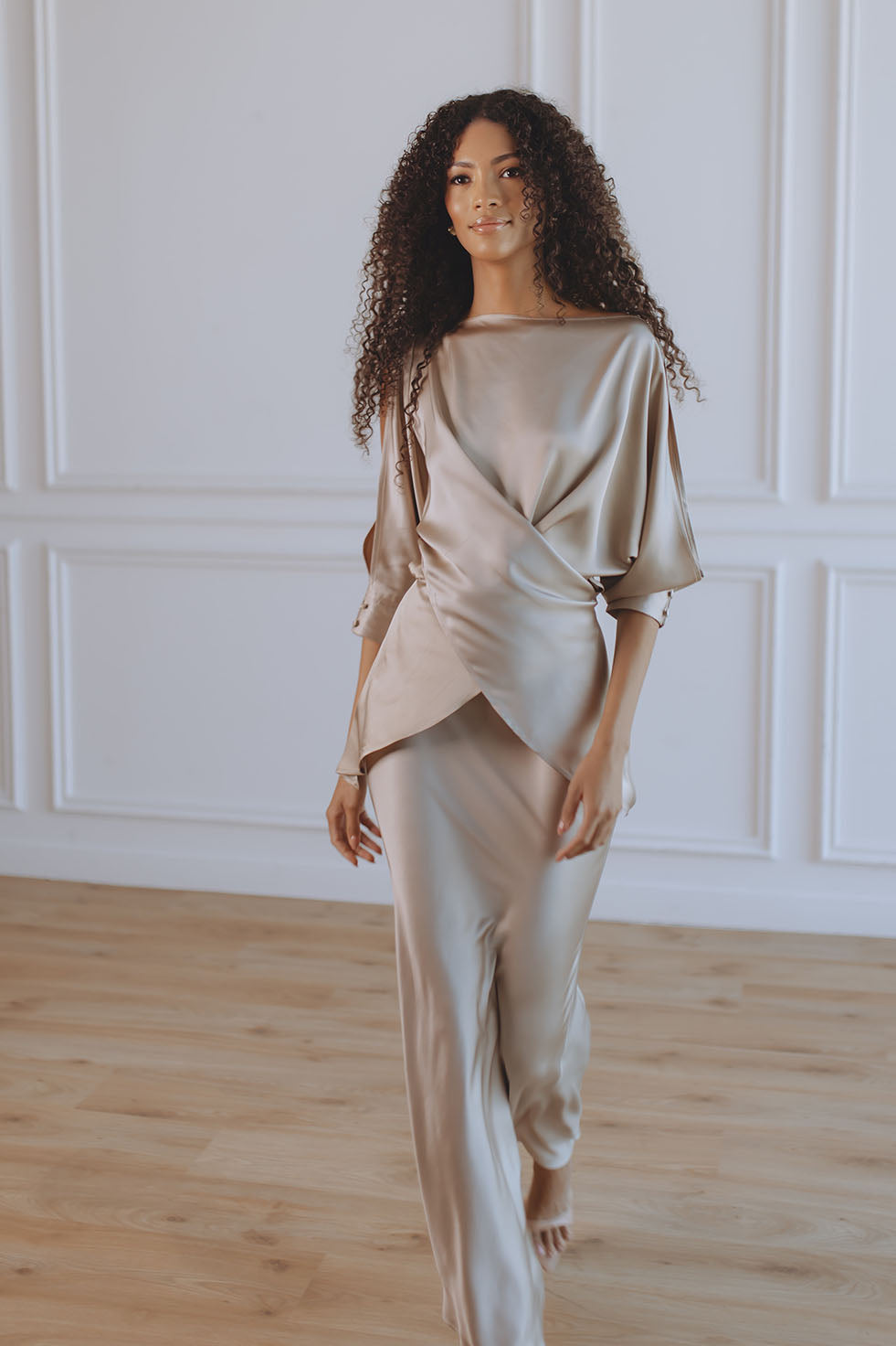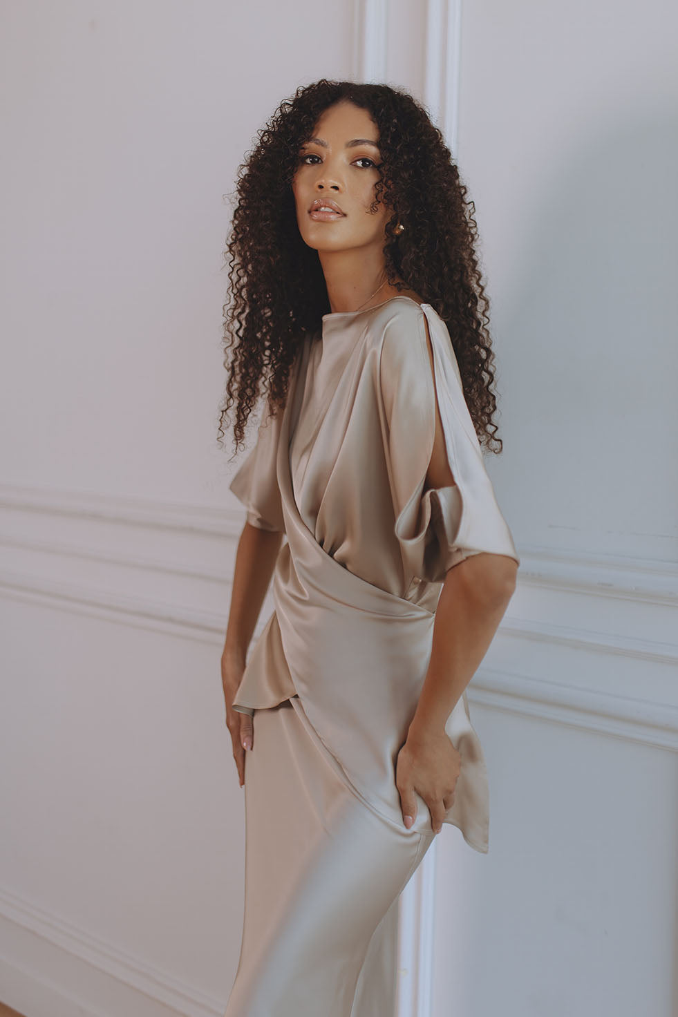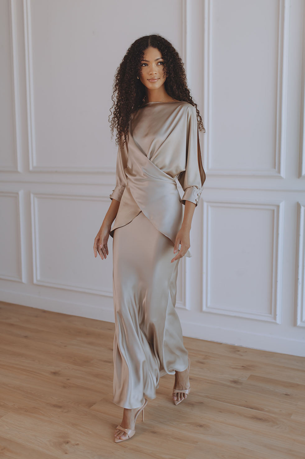 Refined and elegant, the Marcy Satin Blouse in Champagne is cut from lustrous satin that drapes beautifully over the body. The blouse features two front strings that tie at the back, creating a flattering wrap-style silhouette. Designed with elbow-length sleeves, the look is elevated by delicate cut-out detailing and finished with buttoned cuffs for a polished touch. With its bateau neckline and fluid structure, the Marcy Blouse transitions seamlessly from day to night.