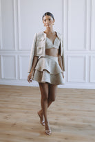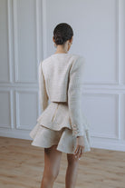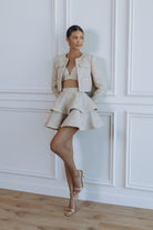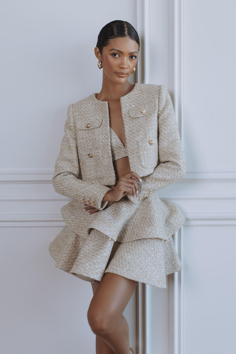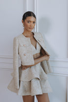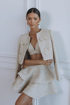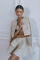 Playful yet polished, the Margaux Bouclé Tiered Mini Skirt brings movement and femininity to a classic bouclé silhouette. Crafted from light-gold bouclé with a delicate shimmer, this skirt features softly structured tiered layers that create volume and fluidity while still maintaining a refined, tailored feel. Designed to sit high on the waist, the Margaux Tiered Mini Skirt flatters the figure and pairs effortlessly with the matching Margaux Bouclé Bralette and Jacket for a statement co-ord look. Finished with a concealed back zip for a clean, seamless finish.