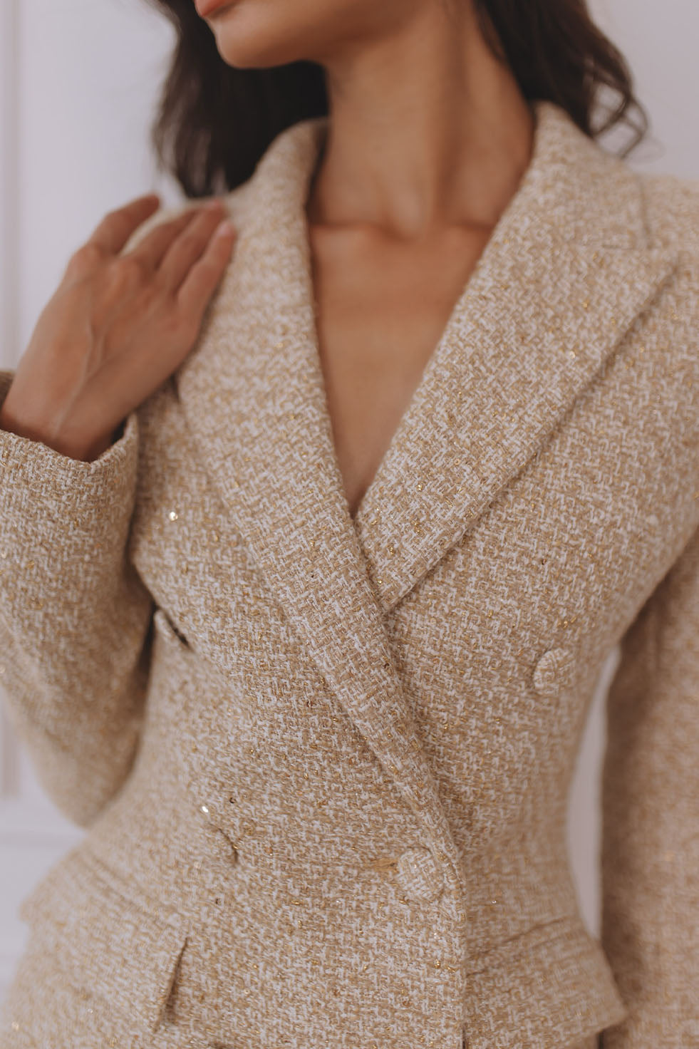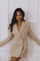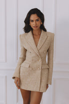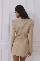 Command attention with the Amara Bouclé Tuxedo Mini Dress in Gold, a statement tailoring piece designed for modern elegance. Crafted from luxe textured bouclé with subtle metallic shimmer, this structured mini dress features a sharp tuxedo-style lapel, double-breasted button front, and strong shoulder shaping for a powerful, feminine silhouette. The cinched waist enhances the figure while the sleek mini length keeps the look effortlessly chic. Finished with a back belt detail for added structure, Amara is perfect for cocktail soirées, evening events, celebrations, and elevated dinners.