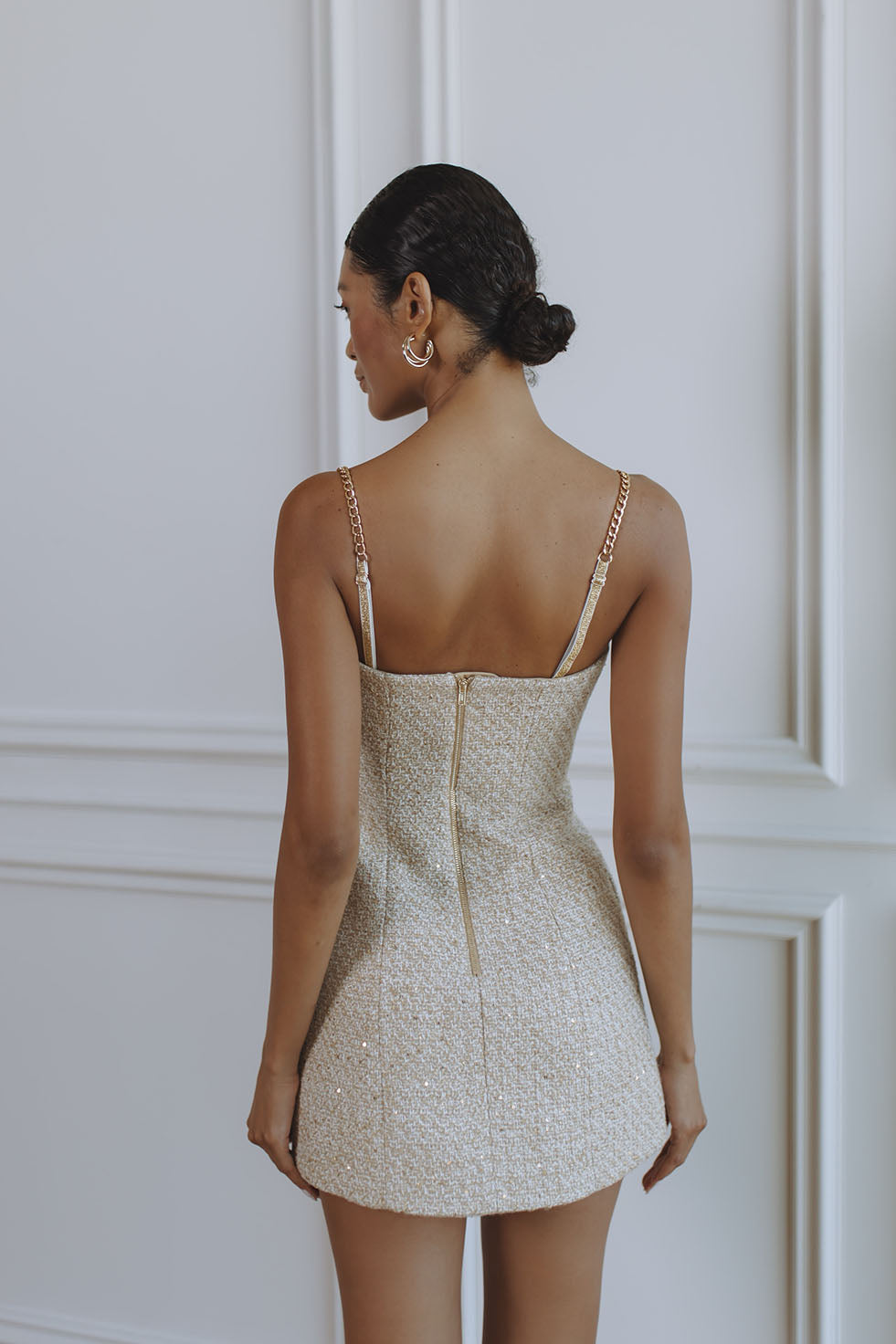 Refined yet striking, the Minola Bouclé Hourglass Mini Dress is designed to sculpt and flatter with effortless elegance. Crafted from textured light-gold bouclé woven with a subtle shimmer, this mini dress features a clean straight neckline and luxe gold-tone chain straps that elevate the silhouette with a modern, jewellery-inspired finish.