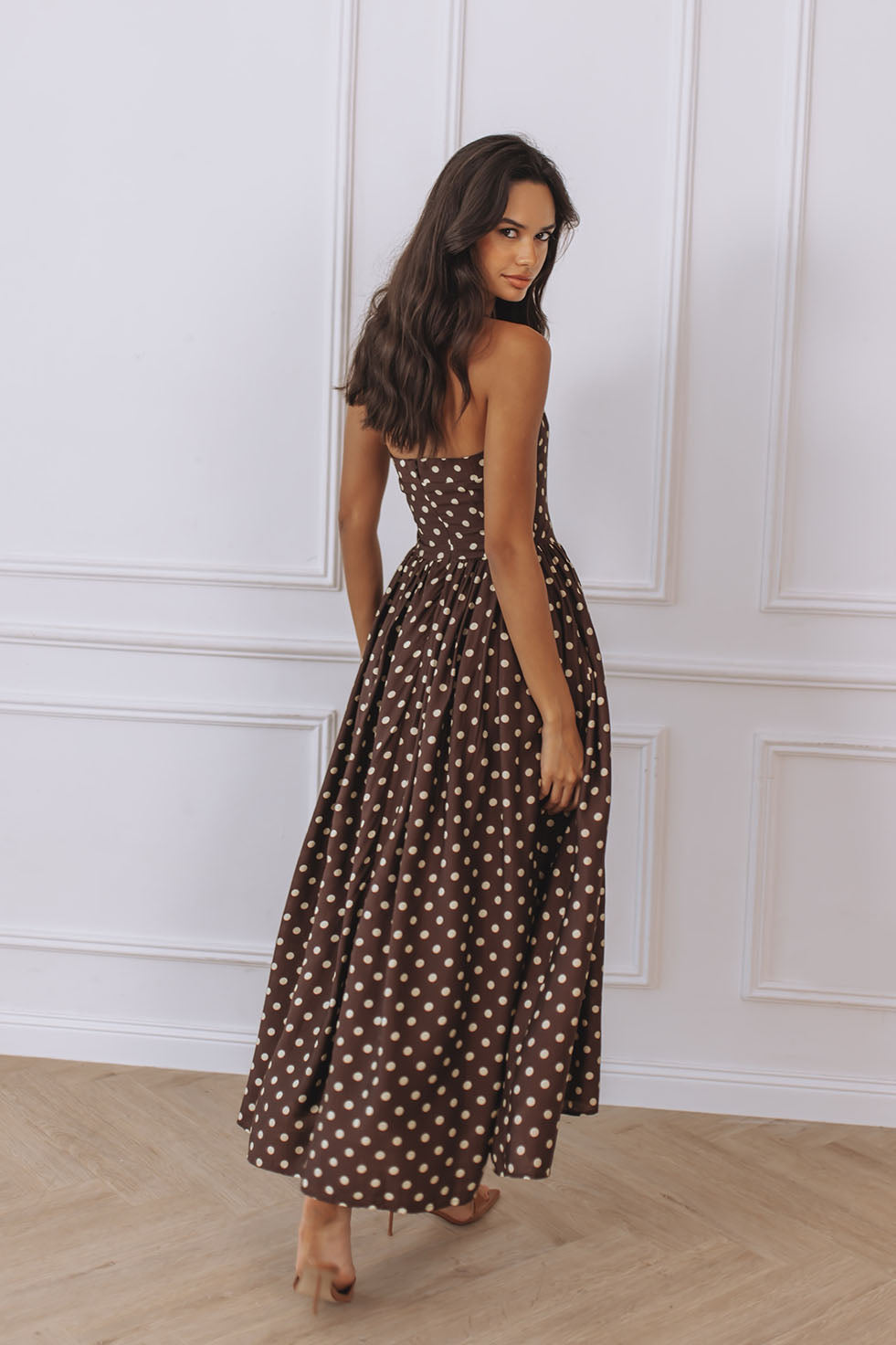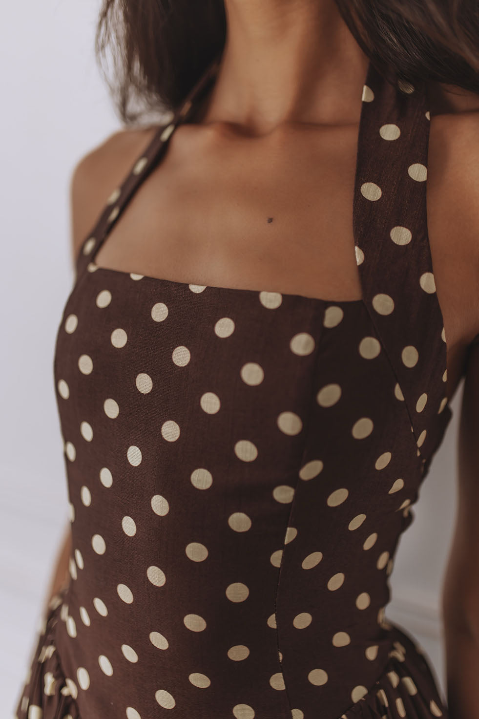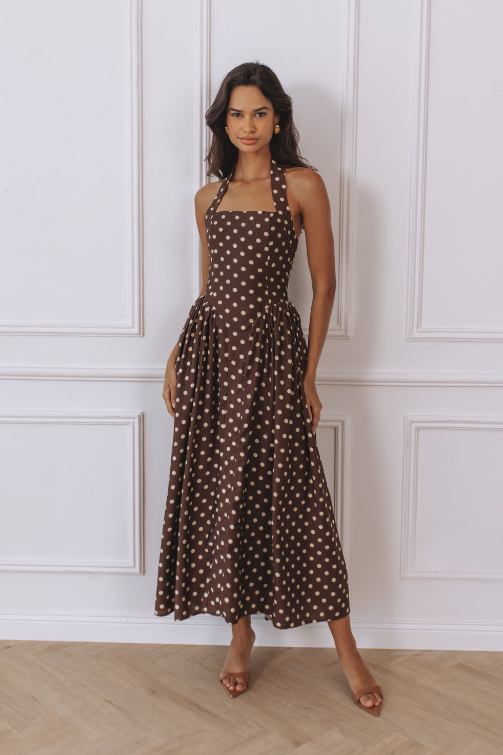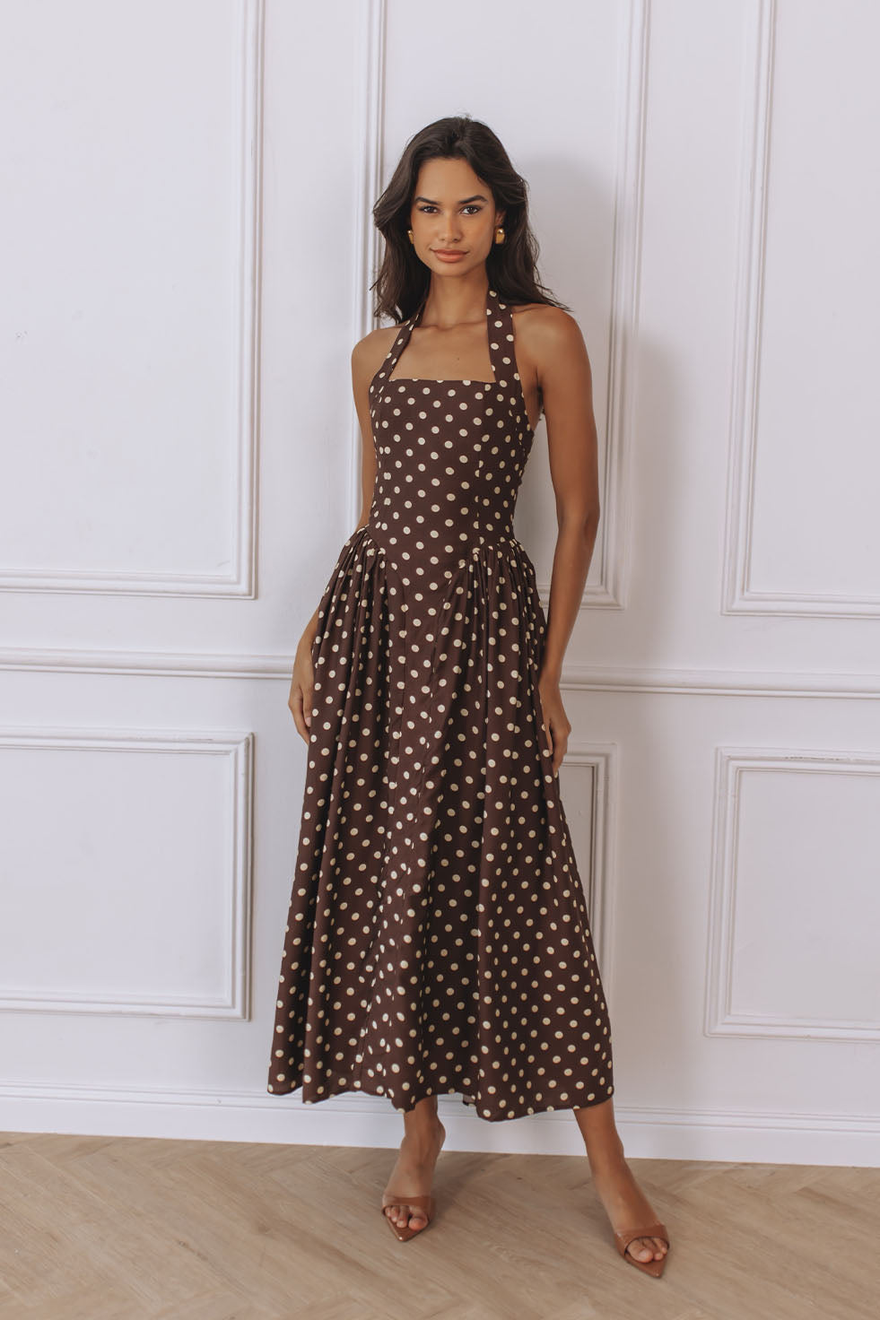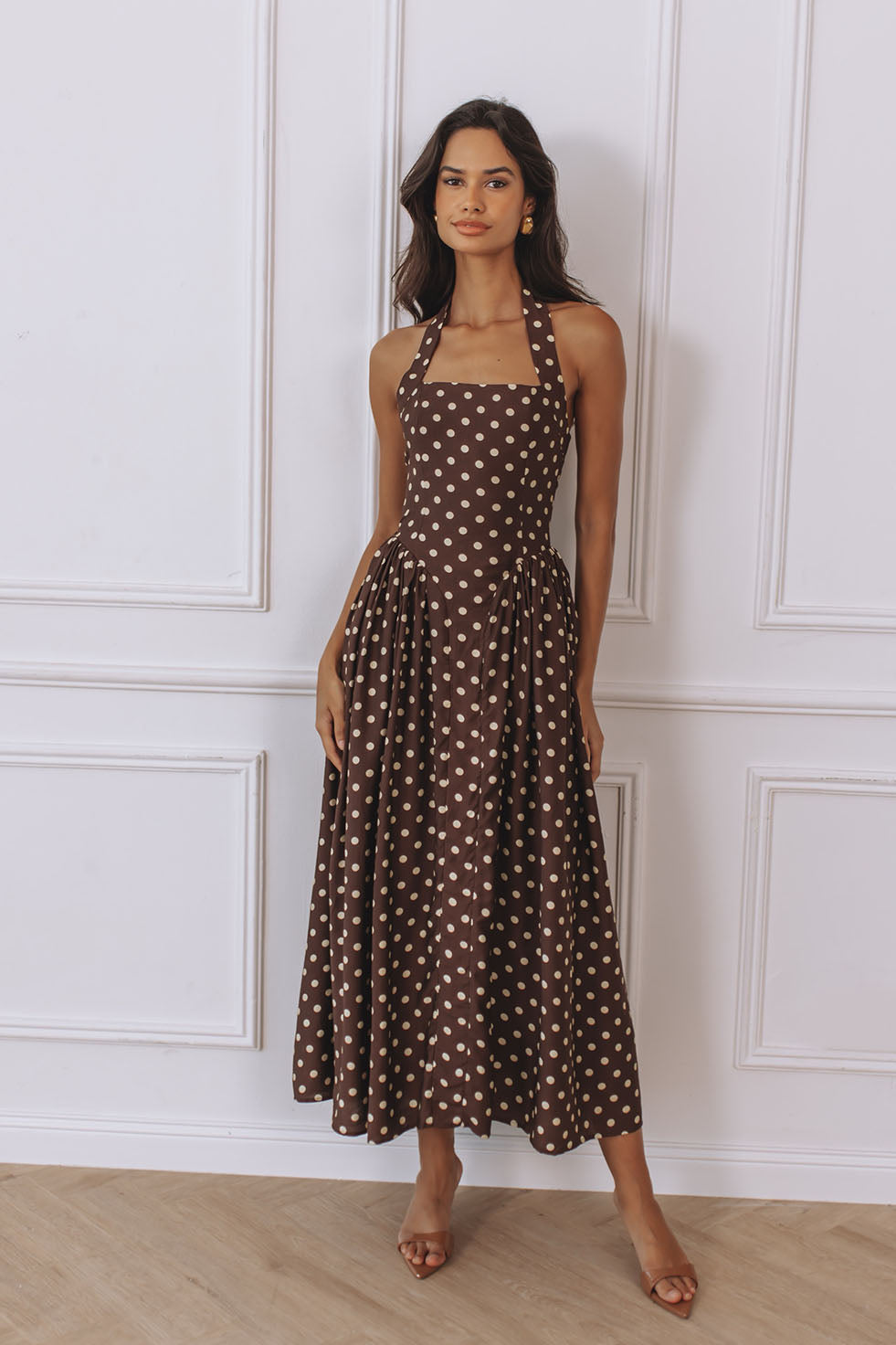 SAMMI HALTER MIDI DRESS - CHOC/LEMON POLKA