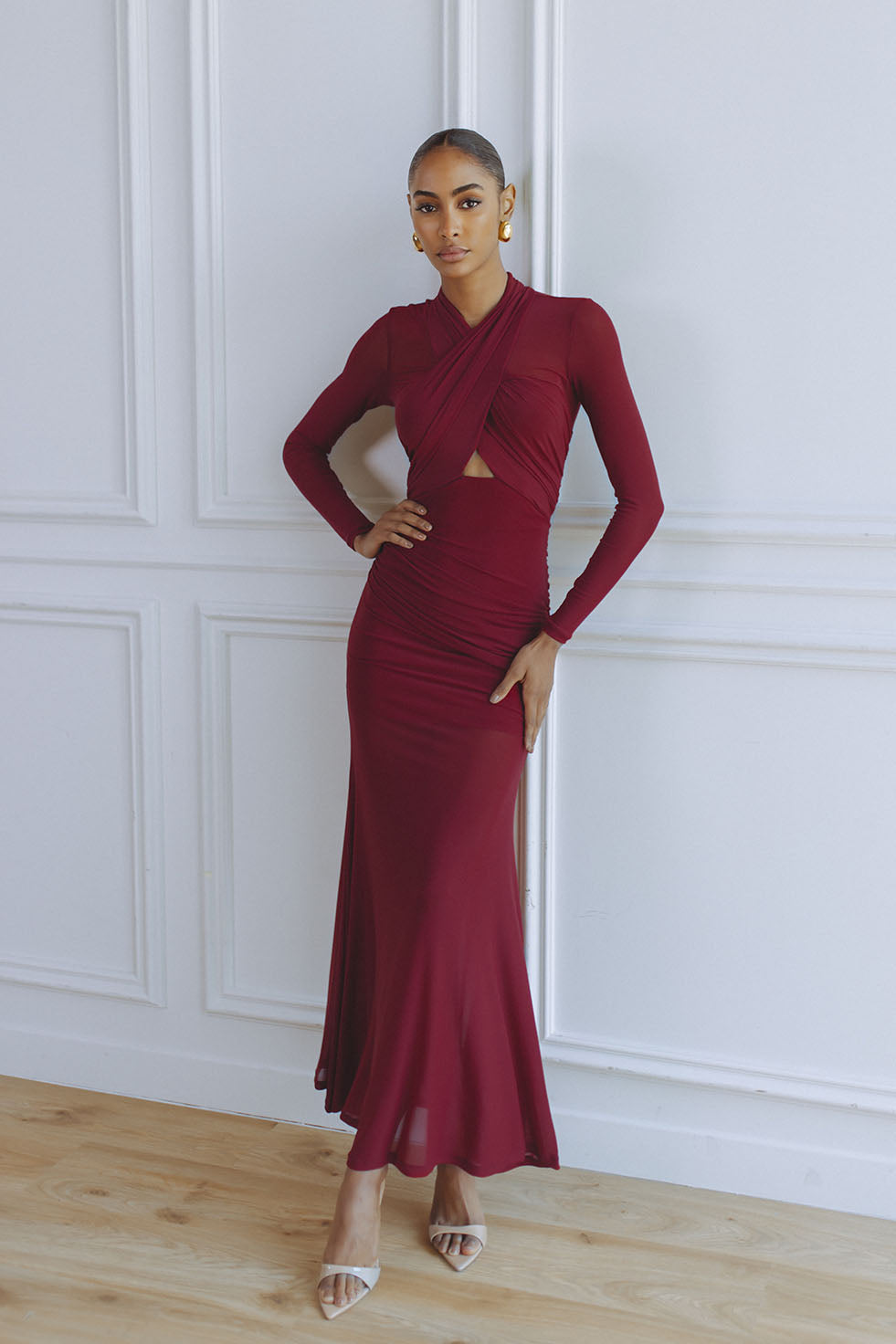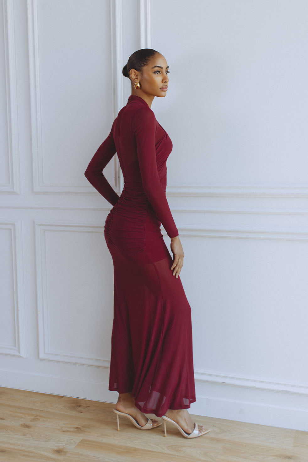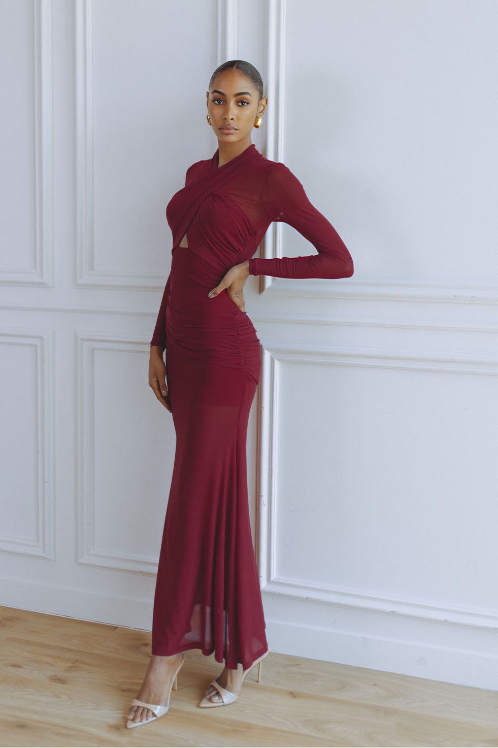 VERIA WRAP MESH MAXI DRESS - BURGUNDY