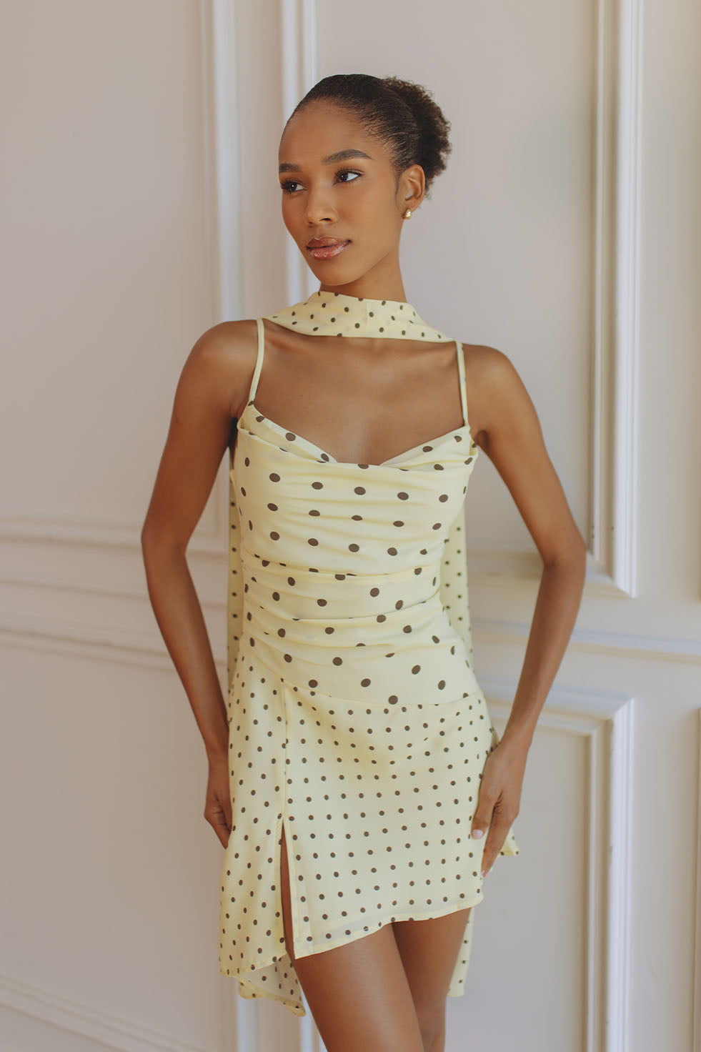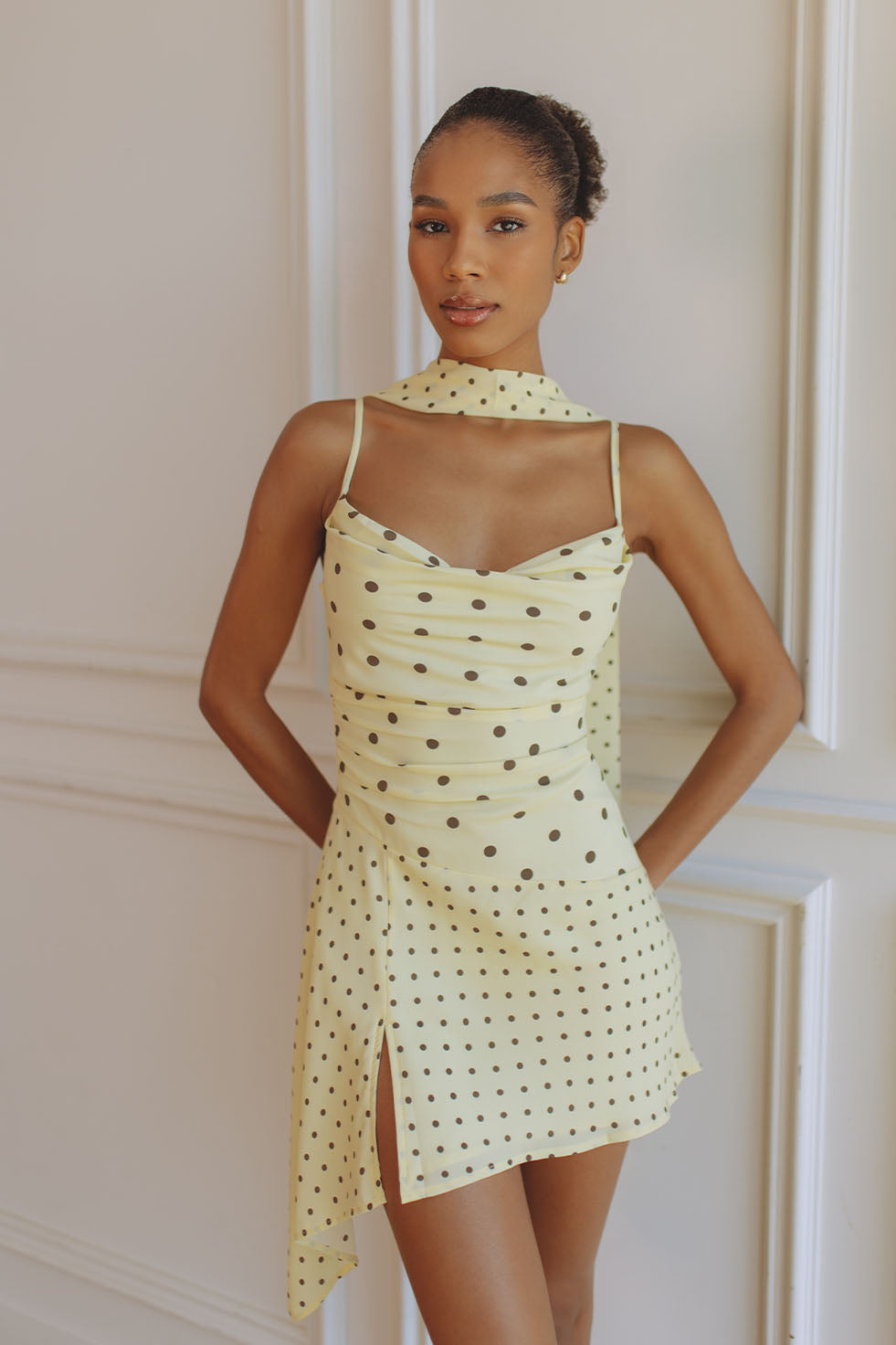 ALORA SCOOP NECK MINI DRESS - LEMON/CHOC POLKA