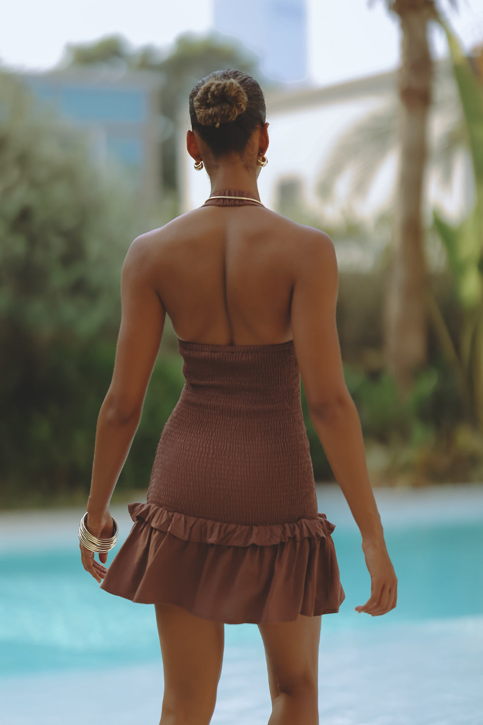 FLEUR SHIRRED HALTER MINI DRESS - CHOCOLATE