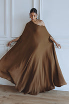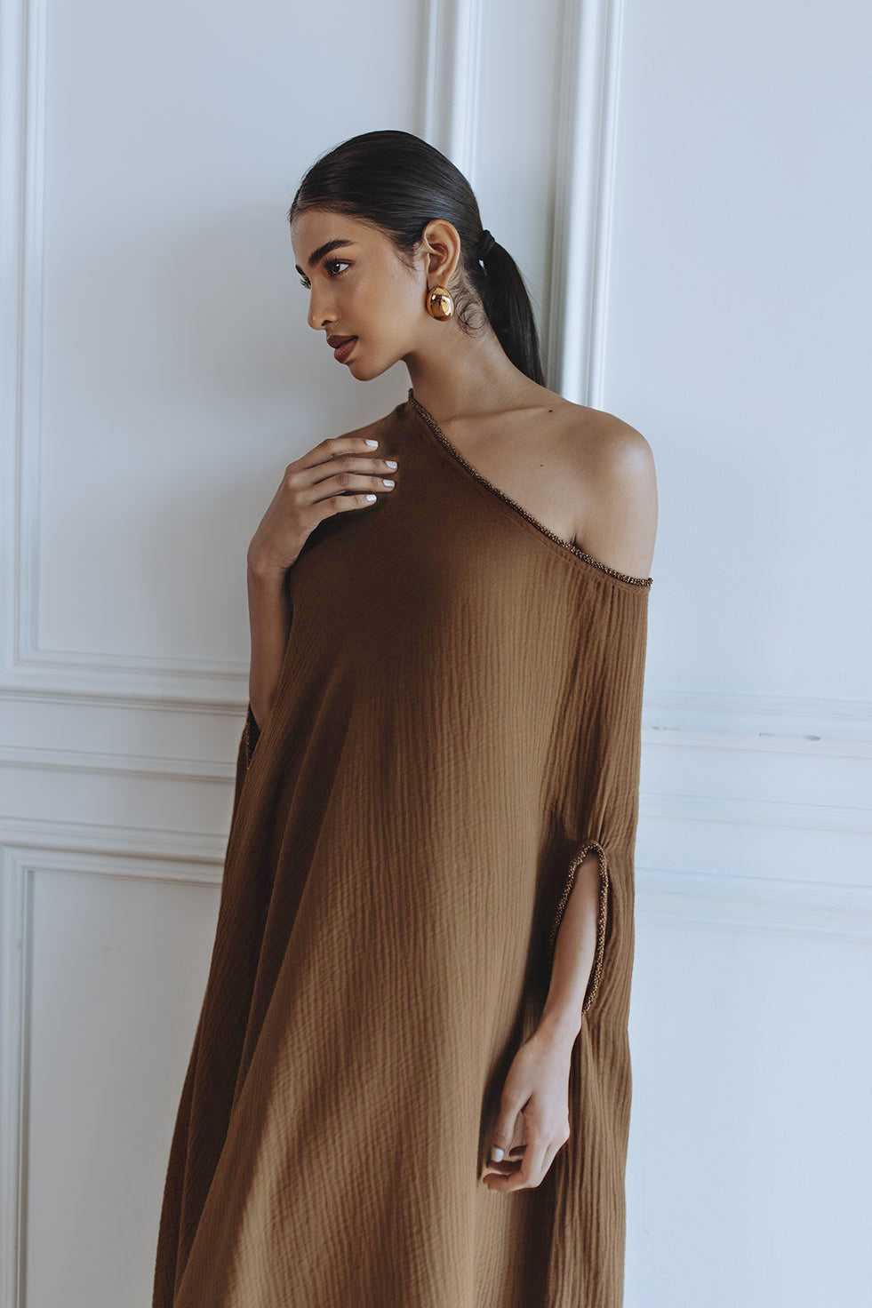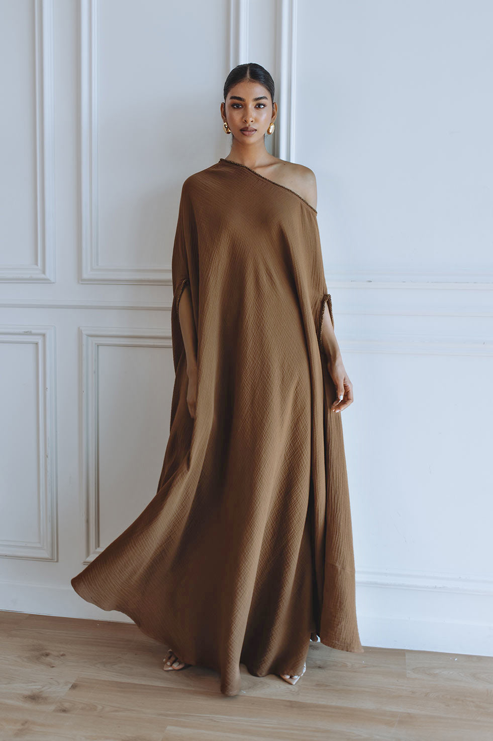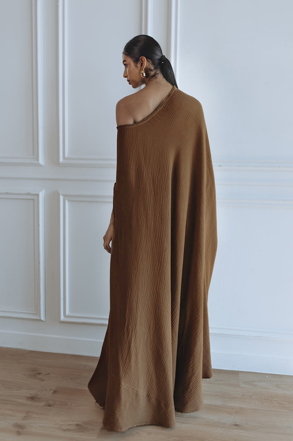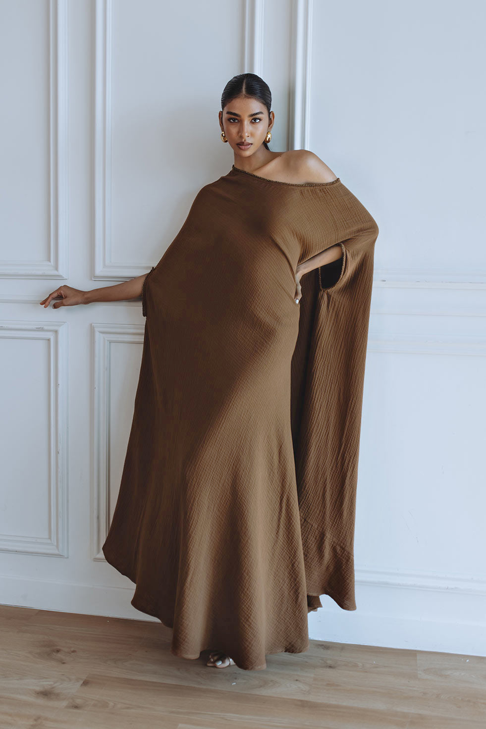 The Leila Kaftan - Brown is crafted from double cotton for a comfortable and luxurious feel. Featuring an elegant off shoulder design and a beautiful black color, it is the perfect choice for a maxi length kaftan.