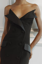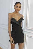 Elevate your evening look with the Arvess Strapless Mini Dress in Black. Designed with a tailored silhouette, this sleek mini channels modern sophistication with its blazer-inspired double-breasted front and structured lapel neckline. The strapless cut adds a daring touch, while the satin-trimmed details create a refined contrast. Perfect for cocktails or a night out, this statement dress balances elegance and edge, making it a must-have for the confident woman who commands attention.