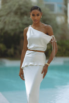 Sleek and versatile, the Darcy Drawstring Maxi Skirt is cut from fluid off white satin for a refined, elegant flow. Featuring a flattering drawstring waistband, it allows you to style it high-waisted for a polished look or mid-rise for relaxed sophistication. The softly flared hemline enhances movement, making it the perfect companion to the matching Darcy Satin Top or your favorite separates. A timeless piece that transitions effortlessly from day to evening.