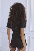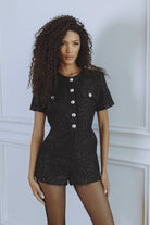 The Estelle Bouclé Playsuit in black is a chic statement piece crafted from textured bouclé fabric with a subtle sparkle finish. Tailored for a flattering silhouette, it features structured short sleeves, a high neckline, and bold silver button detailing down the front for a touch of timeless elegance. Perfect for evening soirées or elevated daywear, this playsuit blends sophistication with modern edge—effortlessly taking you from cocktails to the dance floor.