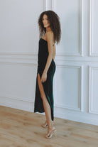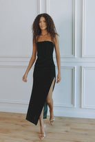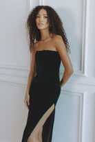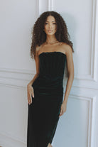 Radiate elegance in the Everlasting Velour Midi Dress in Emerald. This strapless masterpiece features a luxurious velour fabric that hugs your curves beautifully, while the structured bodice and subtle pin-tuck details add sophistication. The sultry thigh-high slit brings a touch of allure, perfect for formal events or holiday soirées. Rich in color and texture, this emerald green dress ensures you’ll captivate from every angle. A timeless choice for unforgettable moments.