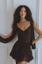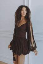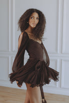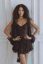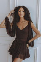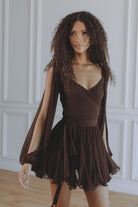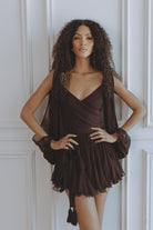 A captivating blend of romance and movement, the Gaia Mini Dress is crafted from luxurious silk chiffon in a deep bitter chocolate hue. Designed with a flattering wrap-style bodice and soft pleating that drapes beautifully over the body. The billowing slit sleeves add effortless drama, while the lace-up back allows for an adjustable, cinched fit. Finished with a ruffled mini hem that dances with every step — and thoughtfully designed with attached shorts underneath for comfort and confidence.