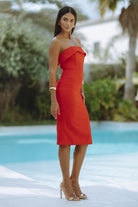 Turn heads in the Georgia Dress in Fire Red. This stunning strapless midi dress features a flattering, fitted silhouette and a chic fold-over neckline, Perfect for a night out or a special occasion, pair it with bold accessories and your favorite heels for an unforgettable look. Ignite your wardrobe with this fiery, elegant piece.