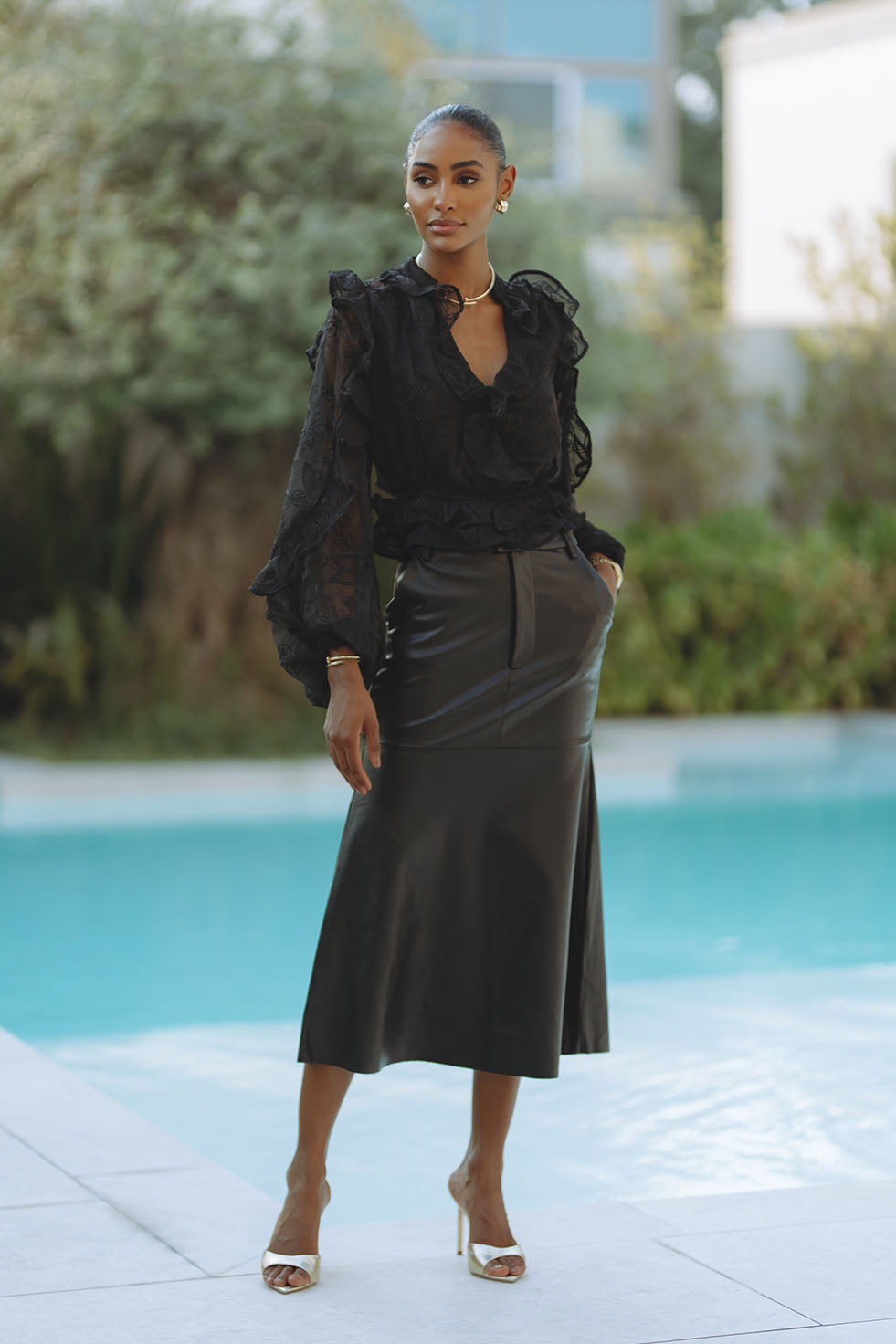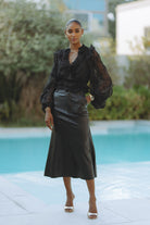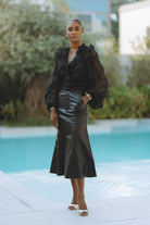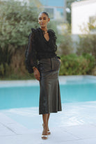 Sleek, structured, and effortlessly sophisticated—the Kindra Skirt is your wardrobe’s power player. Crafted from premium vegan leather, this high-waisted silhouette hugs the hips before flaring into a soft A-line midi. Seam detailing and a tailored fit elevate its modern edge. Whether paired with a romantic blouse or crisp shirting, Kindra adds instant polish and a bold, feminine energy to any look.