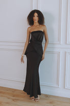 A study in timeless minimalism, the Marcy Strapless Satin Top in black is cut from a lustrous satin that drapes fluidly across the body. The strapless neckline and asymmetric overlay create a soft, sculpted silhouette, while the tie-back detail ensures the perfect fit.