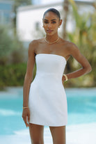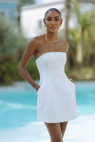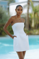 Radiate effortless sophistication in the MINOLA Hourglass Mini Dress. Tailored from a premium, structured fabric, this strapless silhouette flatters with its sculpted bodice and subtly flared hem. The pristine orchid white hue evokes modern romance, while hidden side pockets and an exposed back zip add a chic, contemporary edge. Perfect for elegant parties or summer soirées, this dress invites you to step out with poise and luminous confidence.