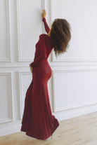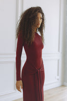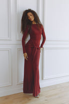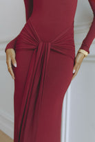 Make a statement in the Sloane Maxi Dress – Burgundy, designed in luxe stretch jersey for comfort with a touch of drama. The elegant bateau neckline and long fitted sleeves balance the striking knotted waist detail that sculpts and flatters the figure. Flowing into a floor-length silhouette, this dress is perfect for evening soirées or any occasion where sophistication meets allure. A rich, timeless shade that brings effortless glamour to your wardrobe.