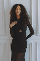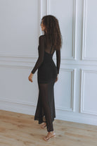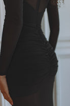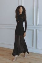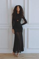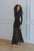 The Veria Wrap Mesh Maxi Dress in black is the definition of modern sophistication with an edge. Designed with a sleek wrap-effect bodice and a cut-out front detail, this piece sculpts the figure while offering subtle allure. The long sheer mesh sleeves and layered mesh maxi skirt create fluid movement, contrasted by the ruched detailing at the back that enhances shape and adds texture.