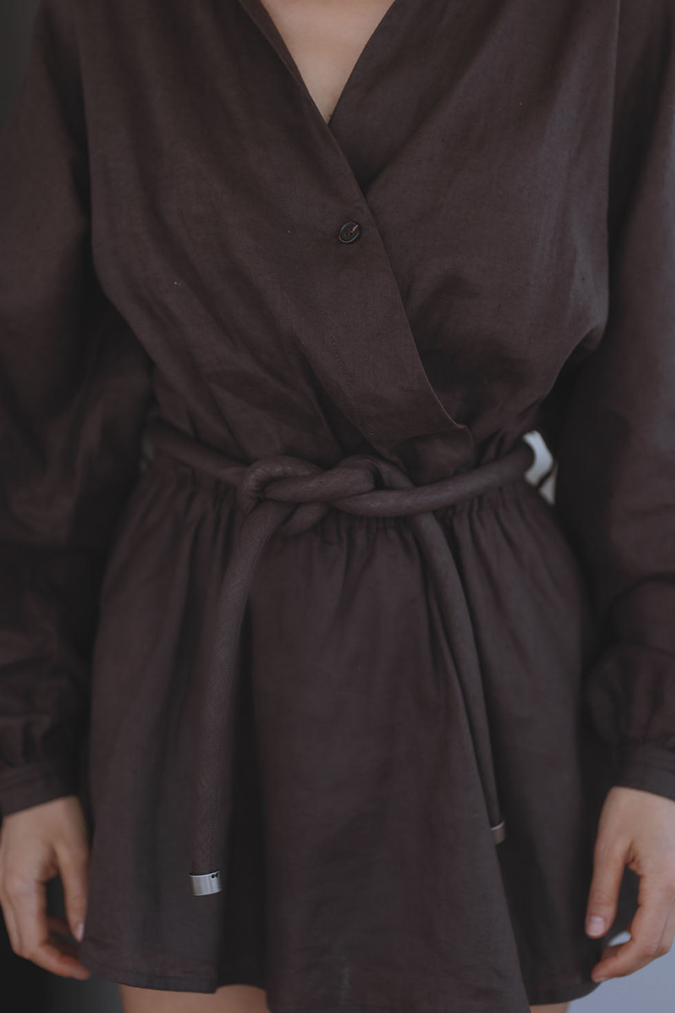Effortless and refined, this chocolate linen mini features a relaxed wrap silhouette, soft volume sleeves and a waist tie to cinch you in. Designed with attached inner shorts for comfort and coverage, the perfect balance of ease and polish.