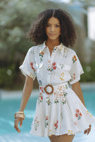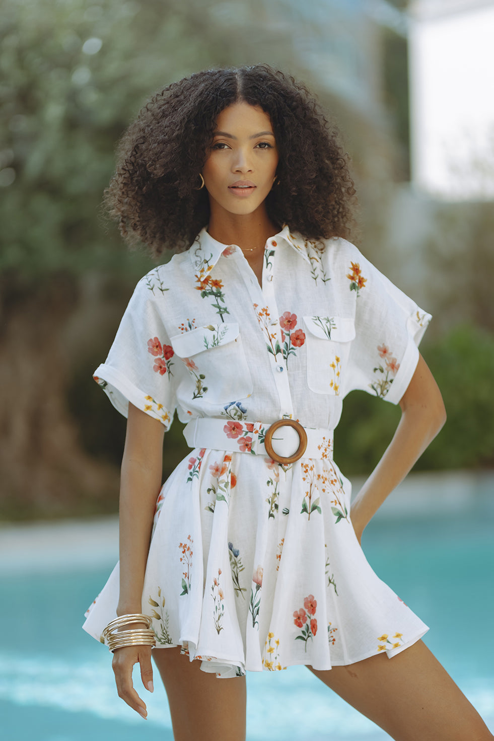 Bask in effortless charm with the BALIA Linen Mini Dress, blooming in our serene meadow print. Crafted from breathable, lightweight linen, it features a shirt-style bodice, flattering flared skirt, and cinched waist with a statement belt. Dual chest pockets add a touch of casual polish. Ideal for sun-drenched days and garden soirées, this dress whispers summer romance with every step. Feel fresh, feminine, and utterly free.