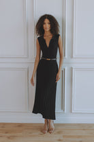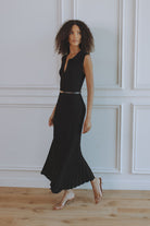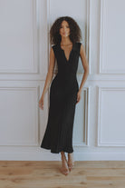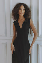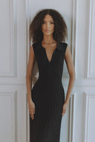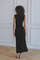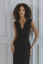 The LIVIA KNIT MAXI DRESS in Black is a relaxed, ribbed knit silhouette designed for effortless everyday elegance. Featuring a soft drape, a V-neckline with a chic collar, and a self-tie at the back, this style can be gently cinched at the waist for a customised fit. Perfect for day-to-night wear, this minimalist black knit dress offers comfort, versatility, and timeless ease.