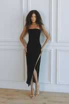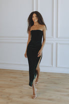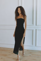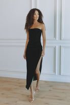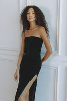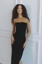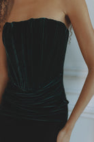 Radiate elegance in the Everlasting Velour Midi Dress in Emerald. This strapless masterpiece features a luxurious velour fabric that hugs your curves beautifully, while the structured bodice and subtle pin-tuck details add sophistication. The sultry thigh-high slit brings a touch of allure, perfect for formal events or holiday soirées. Rich in color and texture, this emerald green dress ensures you’ll captivate from every angle. A timeless choice for unforgettable moments.