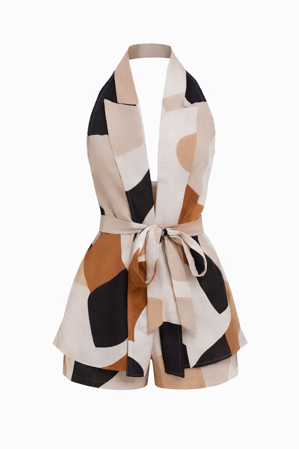 A contemporary halter vest crafted from premium linen in our signature Sandstone Muse print. Designed with a plunging neckline, open back, and a self-tie waist belt to sculpt the silhouette, blending modern femininity with effortless resort elegance.