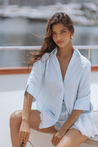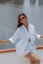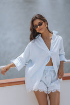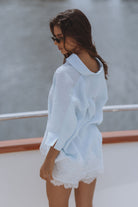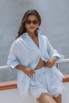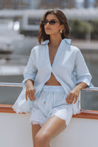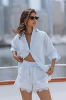 An effortlessly feminine set crafted in airy linen, designed for warm, sun soaked days. The relaxed shirt pairs with delicate lace trim shorts, featuring a soft elastic waist and drawstring for a flattering, easy fit. Perfect for beach escapes, resort lounging, or elevated everyday wear.
