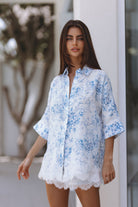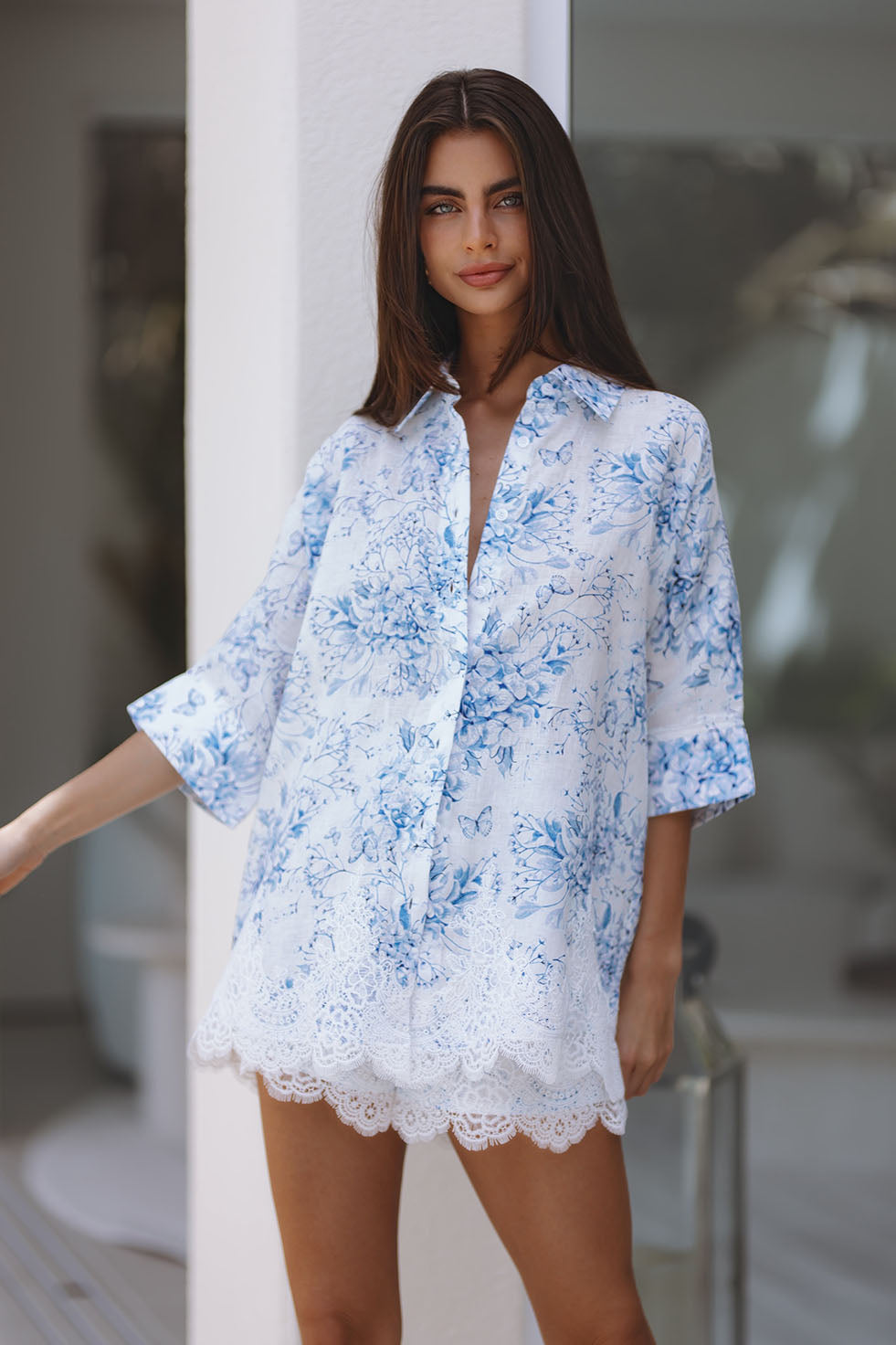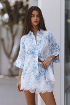 A breezy statement set with a romantic feel, the Addie Lace Linen Set in Azure Meadow is crafted in linen and finished with delicate lace trim. Featuring a relaxed button down shirt and matching shorts, this co-ord is elevated by its soft blue floral print and effortless silhouette.