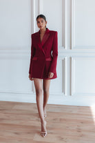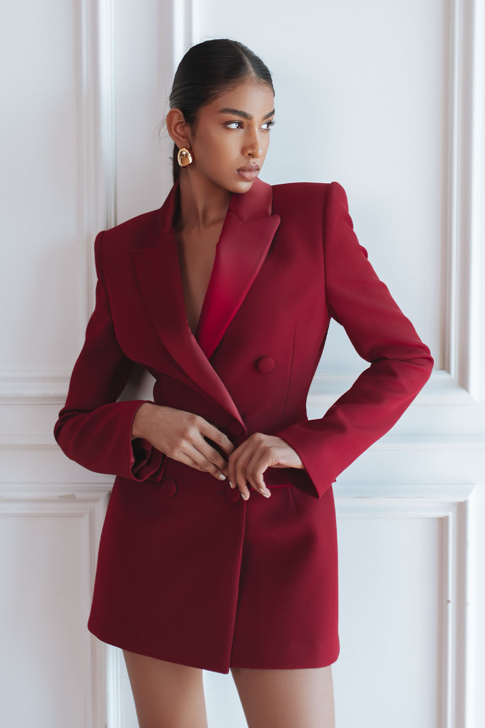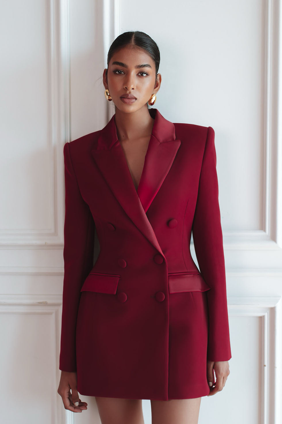 Turn heads in the Amara Tuxedo Blazer Mini Dress in Burgundy — a statement piece designed for modern evening dressing. Cut from luxurious crepe, this tailored mini features a rich burgundy hue, satin-finish lapels, and strong sculpted shoulders for a powerful, feminine silhouette. The double-breasted front and defined waist create a flattering hourglass shape that feels both sharp and sophisticated.