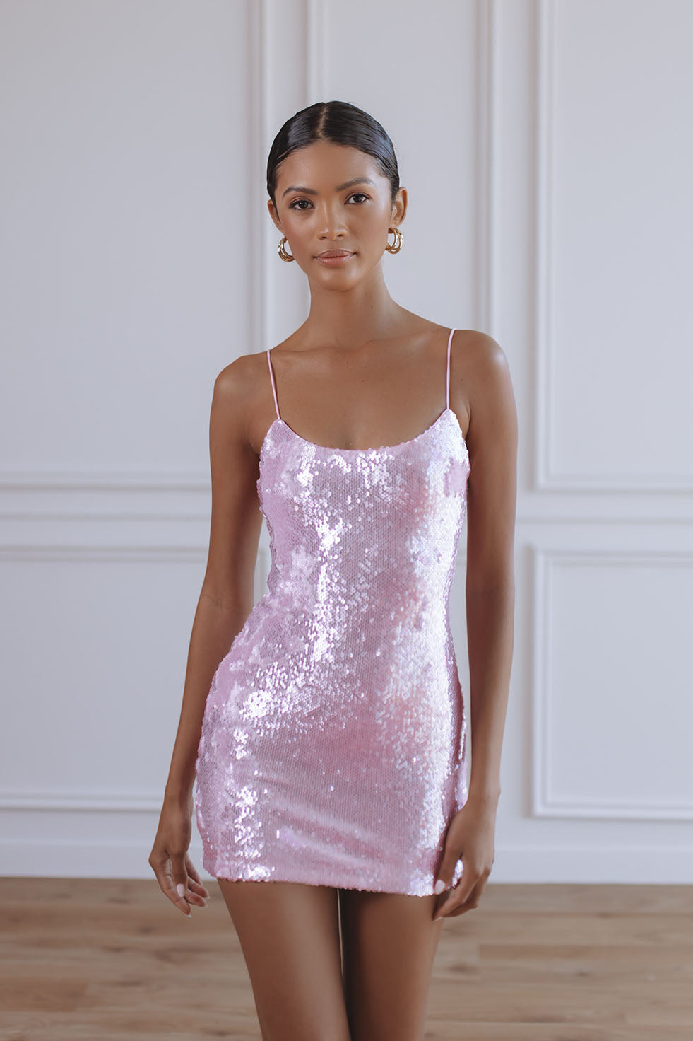 Shimmer through every moment in the Sindy Sequin Mini Dress, a radiant mini crafted in musk pink sequin fabric. Designed with a sleek, body-skimming silhouette, this piece features a soft scoop neckline and fixed delicate straps that sit elegantly on the shoulders. The smooth inner lining ensures comfort while enhancing the dress’s flattering shape.