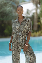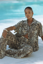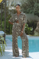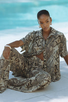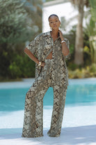 Elevate your off-duty style with the Everlyne Pants, crafted from lightweight viscose in a striking snake print. Designed with a relaxed, wide-leg silhouette and elastic waistband for effortless comfort. Ideal for sun-drenched escapes or stylish city strolls—pair with the matching shirt for a statement set or wear solo for a touch of wild sophistication.