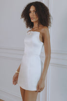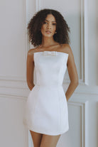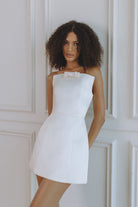 The Audrey Hourglass Mini Dress in ivory redefines timeless elegance with a fresh, sophisticated touch. Designed in a structured silhouette, this strapless mini dress beautifully sculpts the waist and flatters the figure with its contoured seams. A delicate bow accent at the neckline adds subtle femininity, while the clean ivory hue makes it a chic choice for bridal events, celebrations, or elevated evenings out.