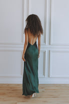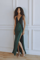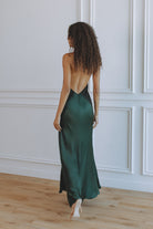 The Estrella Halter Maxi Dress in emerald green is designed for striking evening elegance. Cut from fluid satin with a luminous finish, it features a halter neckline with a plunging V-cut framed by delicate lace on the front for a touch of allure. The daring thigh-high slit elongates the silhouette, while the open back with tie detail completes the look with sensual sophistication.
