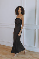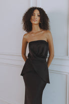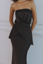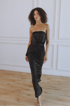 A study in timeless minimalism, the Marcy Strapless Satin Top in black is cut from a lustrous satin that drapes fluidly across the body. The strapless neckline and asymmetric overlay create a soft, sculpted silhouette, while the tie-back detail ensures the perfect fit.