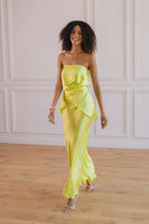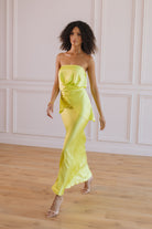 Turn heads in the Marcy Strapless Satin Top, crafted in a lustrous lime satin that drapes beautifully across the body. This statement silhouette features a fluid overlay front that softly gathers at the waist, creating an effortlessly sculpted look. The back ties allow for an adjustable fit, ensuring both comfort and shape.